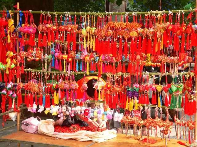 端午節(jié)小孩佩香囊,傳說有避邪驅瘟之意,實際是用于襟頭點綴裝飾。香囊內有朱砂、雄黃、香藥,外包以絲布,清香四溢,再以五色絲線弦扣成索,作各種不同形狀,結成一串,形形色色,玲瓏可愛。