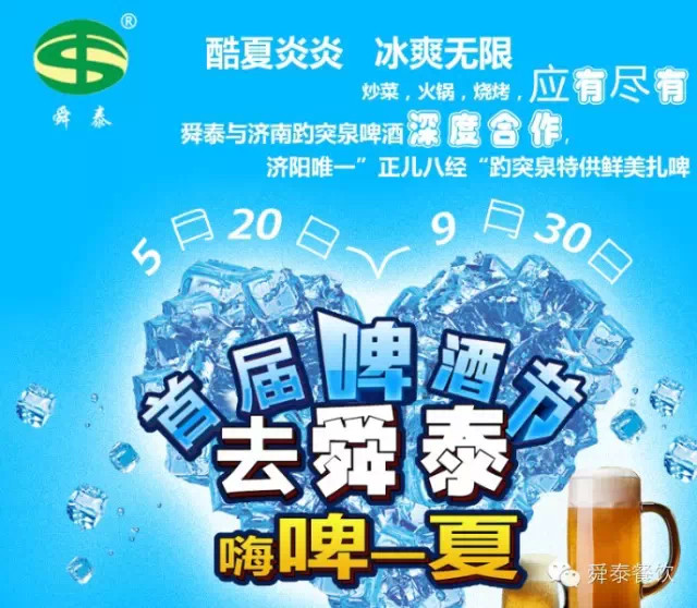 炎炎盛夏,啤酒節(jié)來襲。濟南舜泰餐飲管理有限公司與濟南趵突泉啤酒深度合作,舜泰成為濟陽唯一“正兒八經(jīng)”趵突泉鮮美扎啤供應處。味道鮮美的扎啤加上舜泰的炒菜、火鍋、燒烤,定會讓您開心一夏!