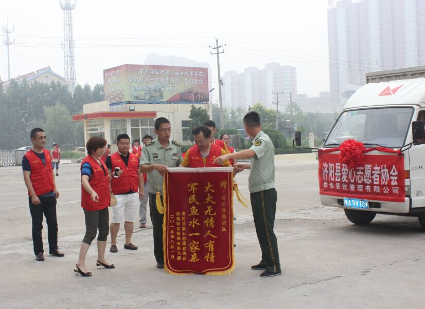 2015年八一建軍節(jié)來臨之際,濟南舜泰餐飲管理有限公司攜手濟陽縣愛心志愿者協(xié)會為濟陽消防大隊官兵送去錦旗和愛心物資。